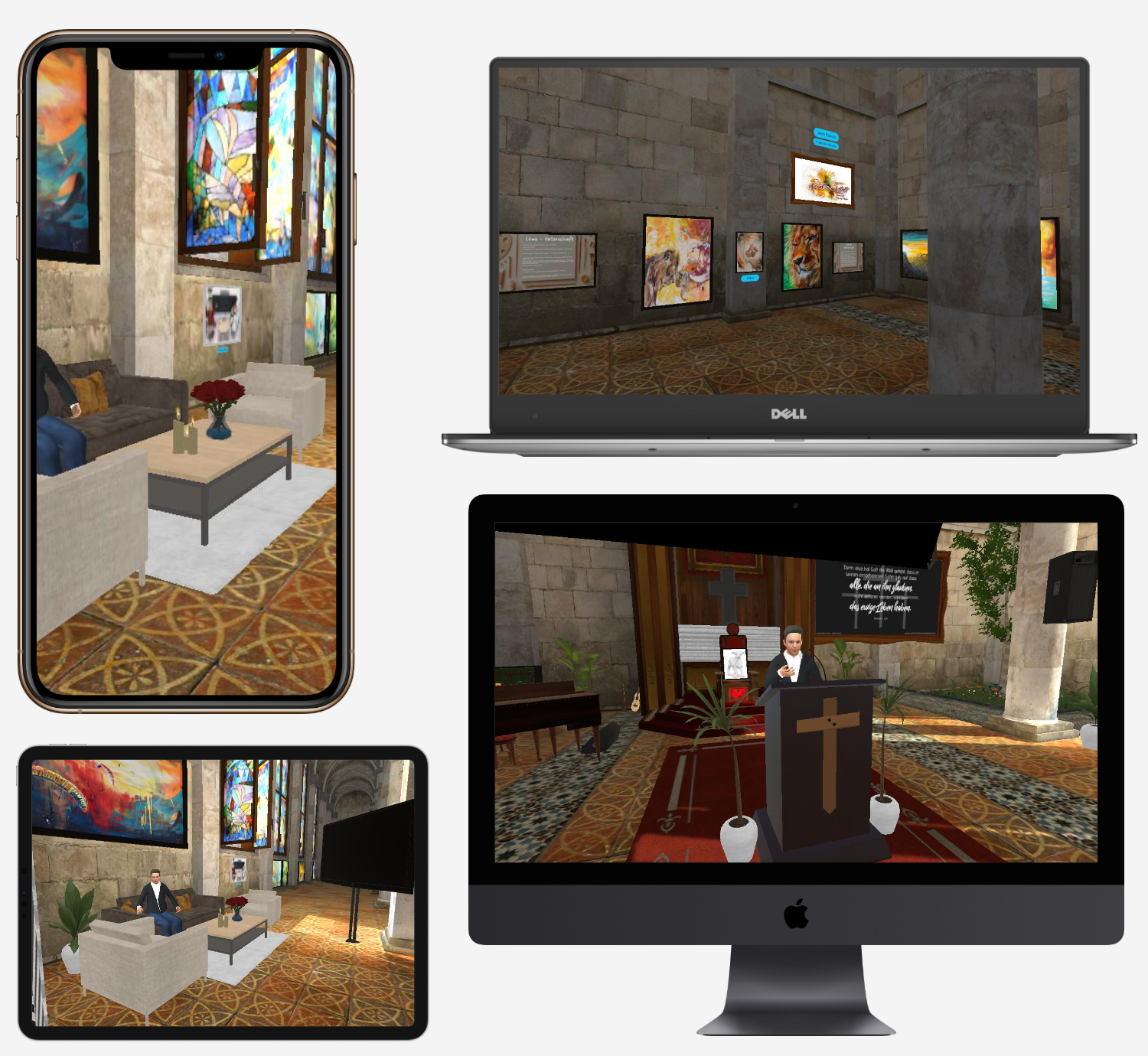 In Engage VR kann man sich nicht nur hören und sprechen, sondern auch Gesten und Mimik ausdrücken. Über Lösungen wie Zoom wären die Teilnehmer in gewisser Weise voneinander getrennt und sehen jeweils nur einen kleinen Teil vom Gegenüber. Oft ist es schwierig, die Wortbeiträge flüssig zu koordinieren oder eine zufriedenstellende Tonqualität zu erreichen. Die virtuelle Realität hingegen ermöglicht es, zusammen mit den anderen Teilnehmern in eine inspirierende und ästhetisch gestaltete Welt einzutauchen, was den Austausch auch online zu einer lebendigen Gemeinschaftserfahrung macht. Im Vergleich zu herkömmlichen Treffen bietet die Interaktion in VR einen zusätzlichen Vorteil: sie ist weltweit überall sofort verfügbar, wo es Internet gibt, also z.B. auch auf Reisen und es können im Anschluss, wie vor Ort in einer Gemeinde, Gespräche geführt werden.